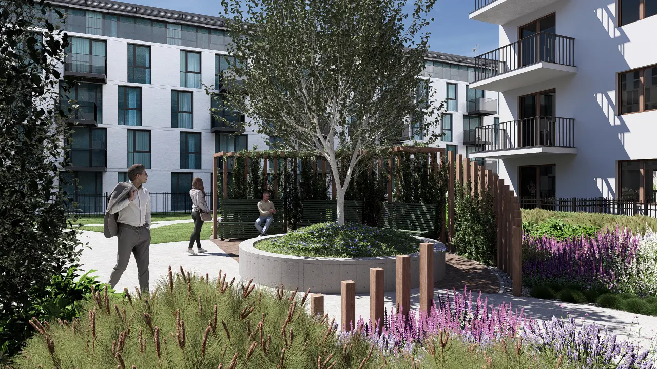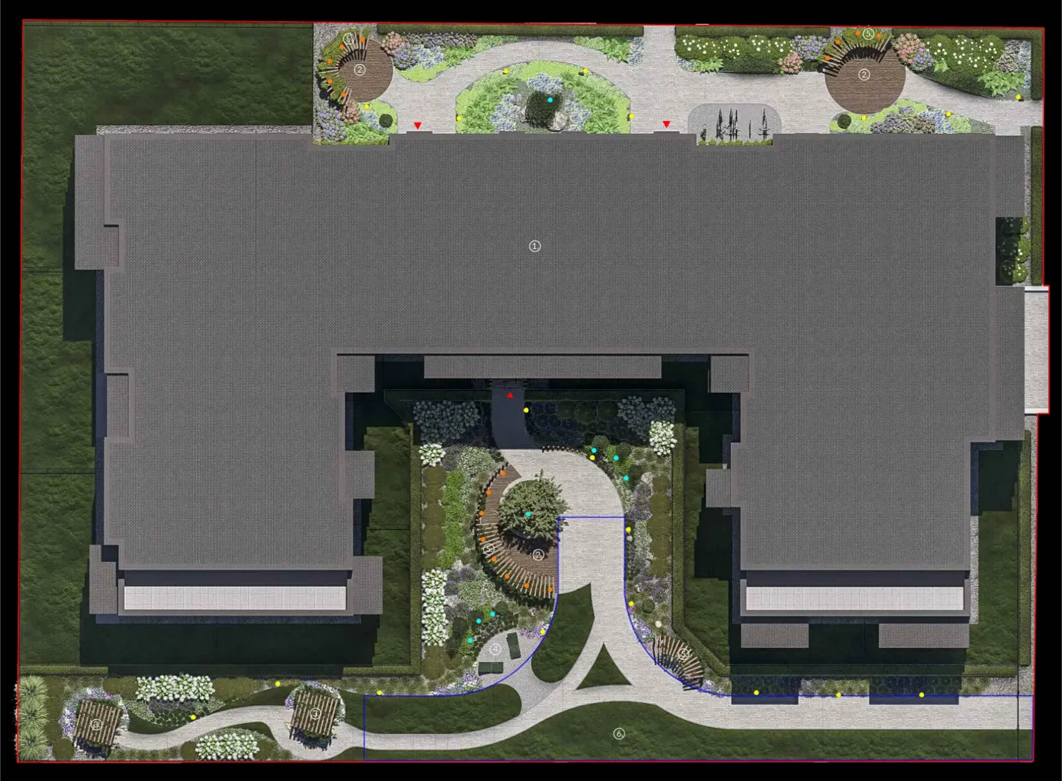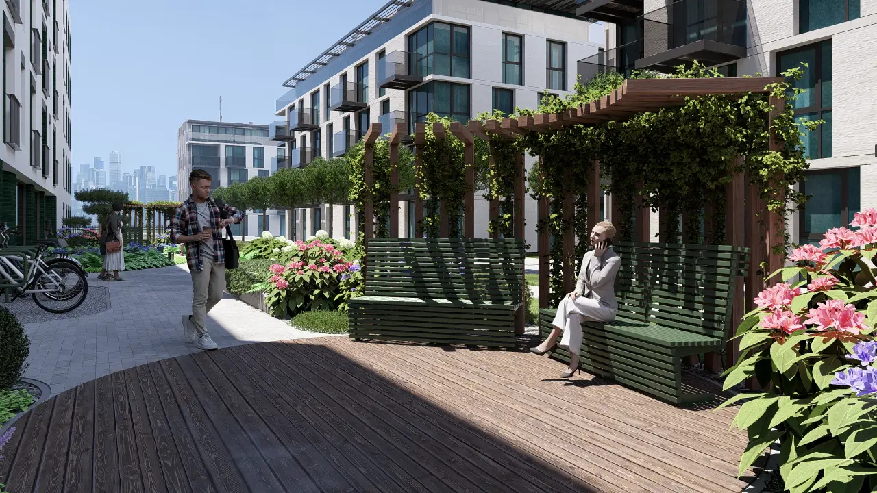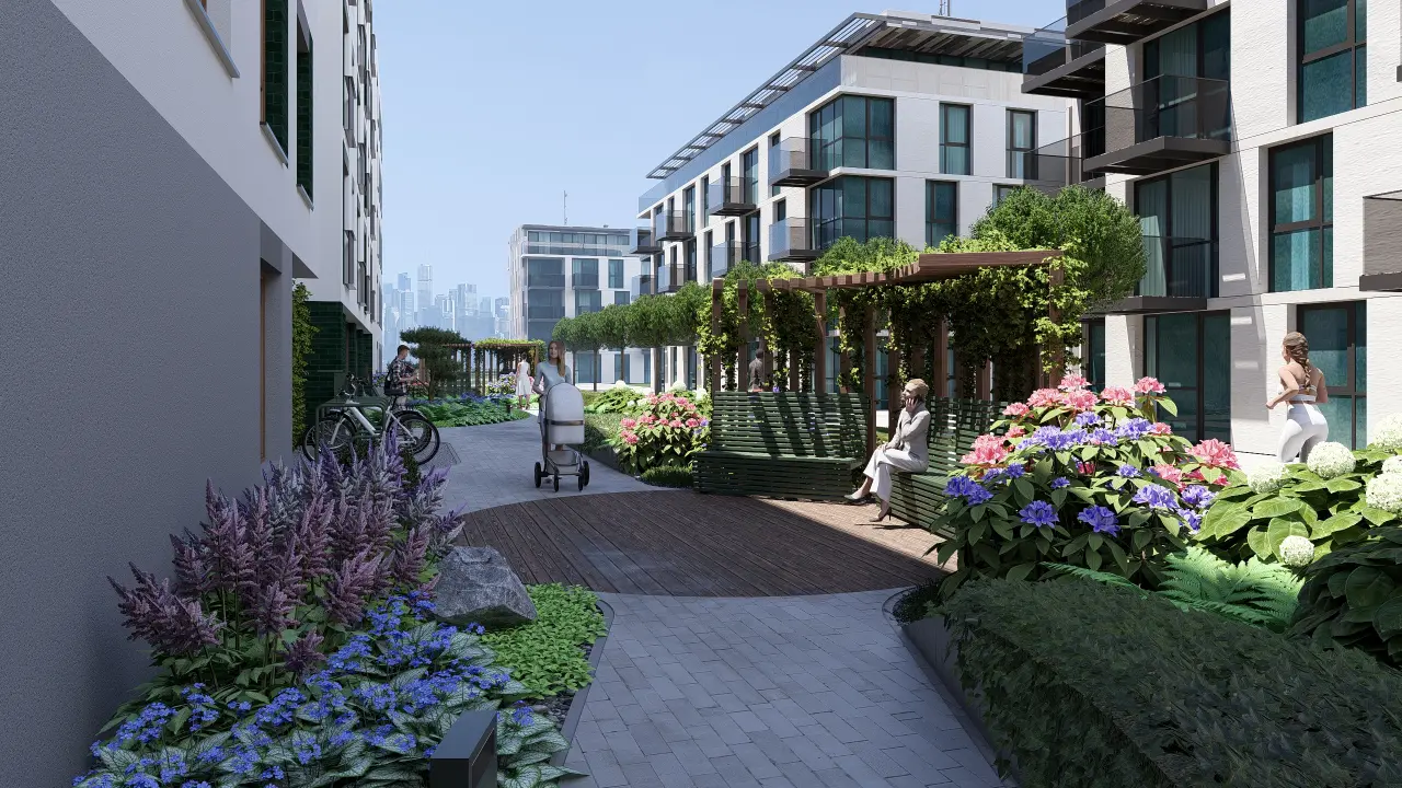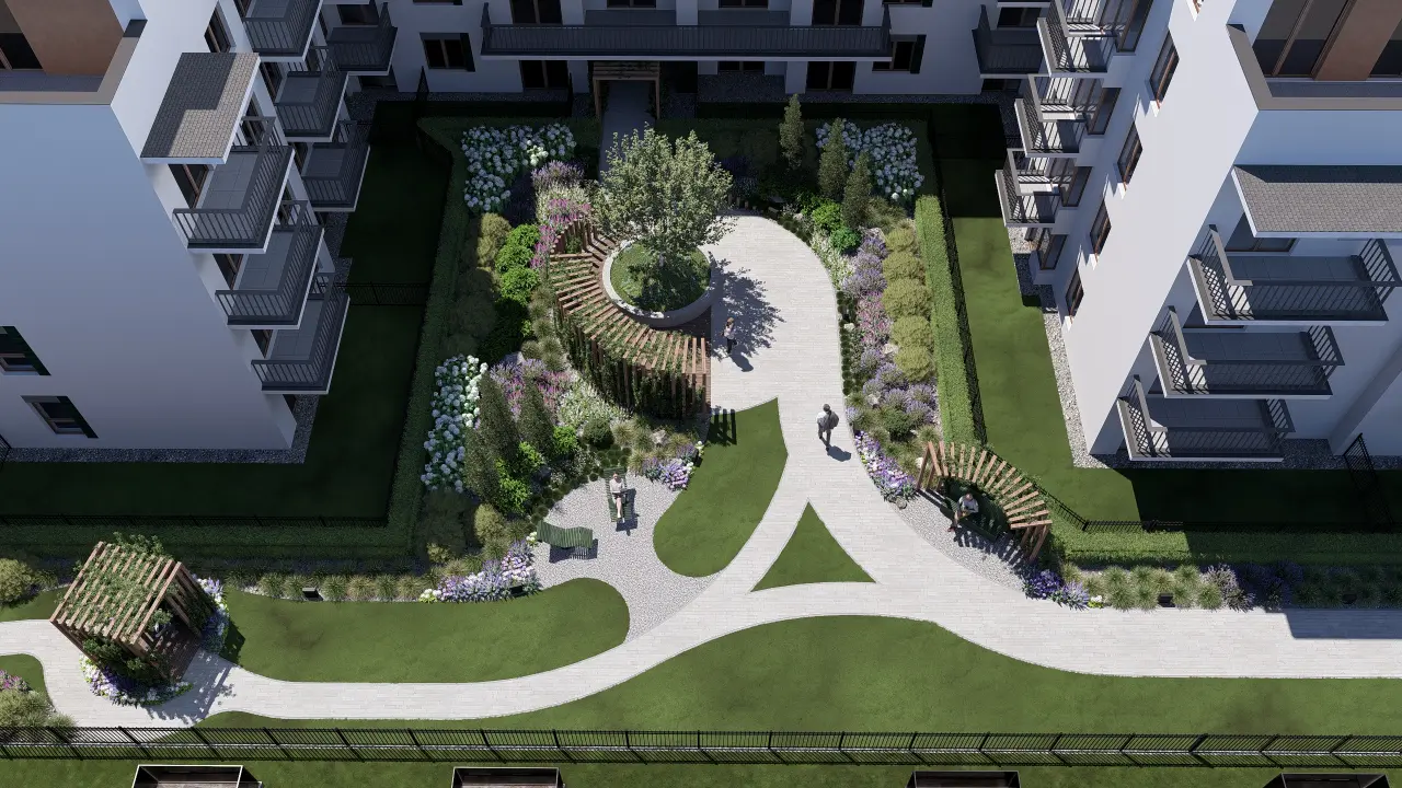 Strefa dziedzińca: zastosowano głównie gatunki ozdobne, wieloletnie, odporne na suszę i ekspozycję słoneczną, które tworzą zróżnicowane kompozycje zieleni wysokiej i niskiej, zapewniając zarówno funkcje estetyczne, jak i osłonowe. Roślinność w tej części ma także wspierać klimat relaksu i intymności.