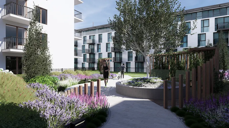 - nasadzenia izolacyjne z wysokich traw ozdobnych, gęstych krzewów i niskich form żywopłotów, pełniące funkcję wizualnej bariery między wspólną przestrzenią a indywidualnymi ogródkami lokatorskimi